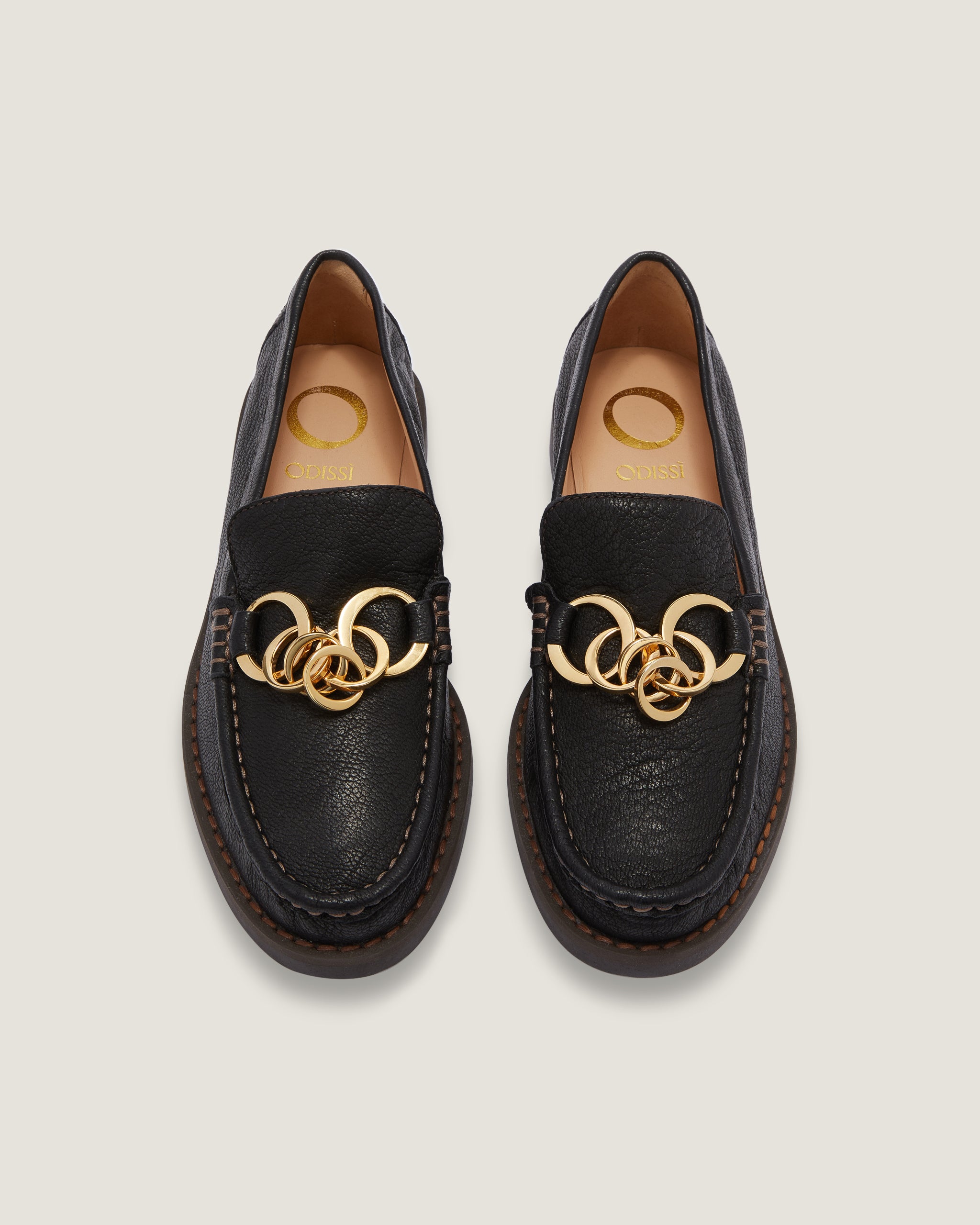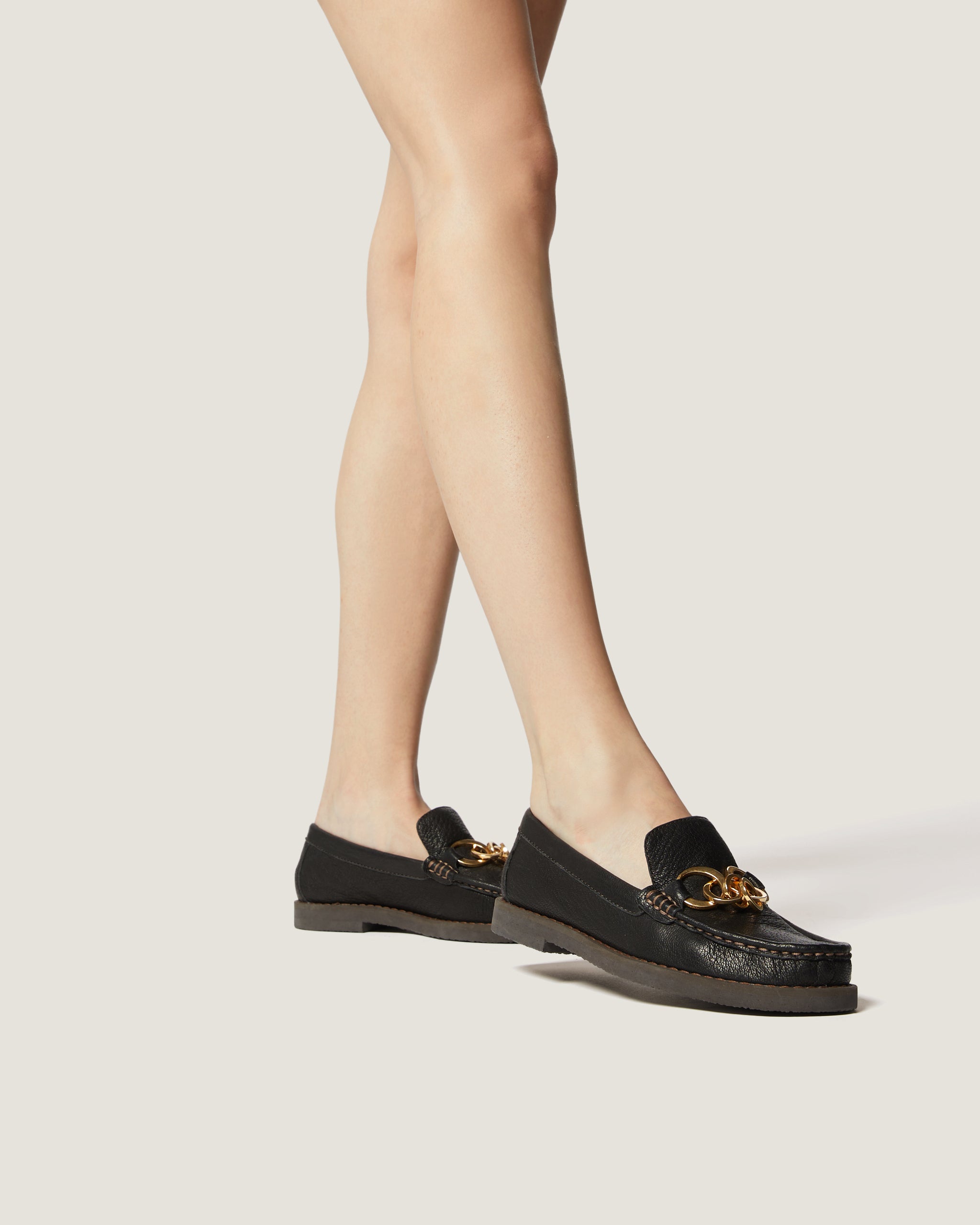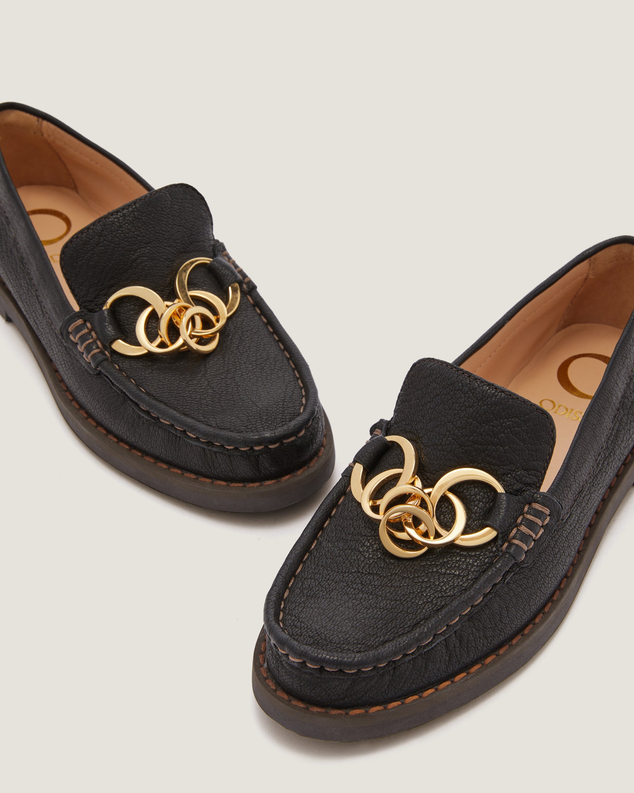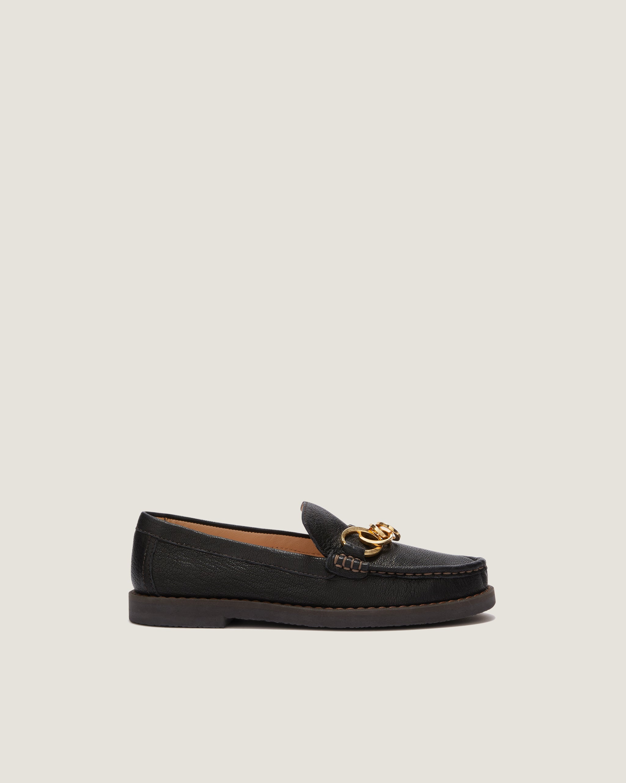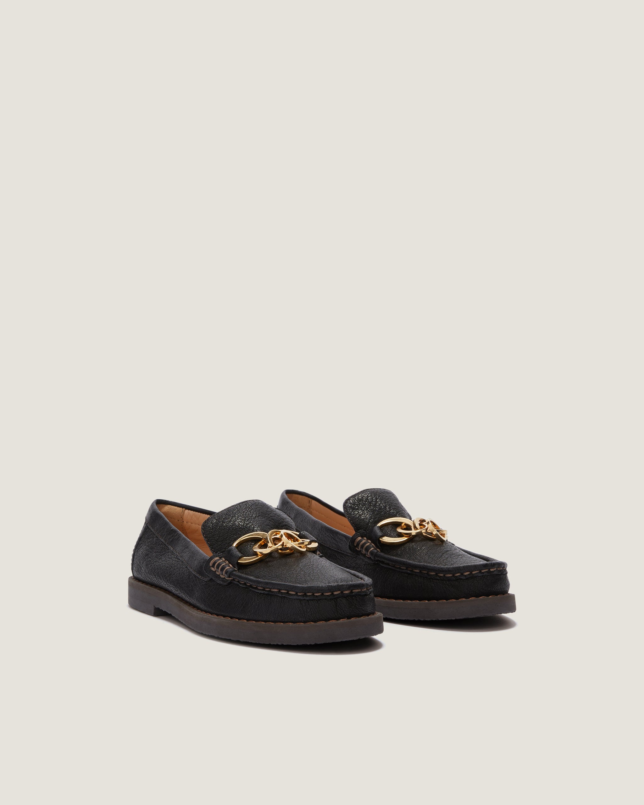 The Jane loafer black grainy goat leather is a distinctive version of an evergreen adorned with a multi-O chain in gold-toned metal, adding a signature decorative touch. In a sophisticated neutral hue, it features a tubular construction, padded insole, and hand-stitched details.