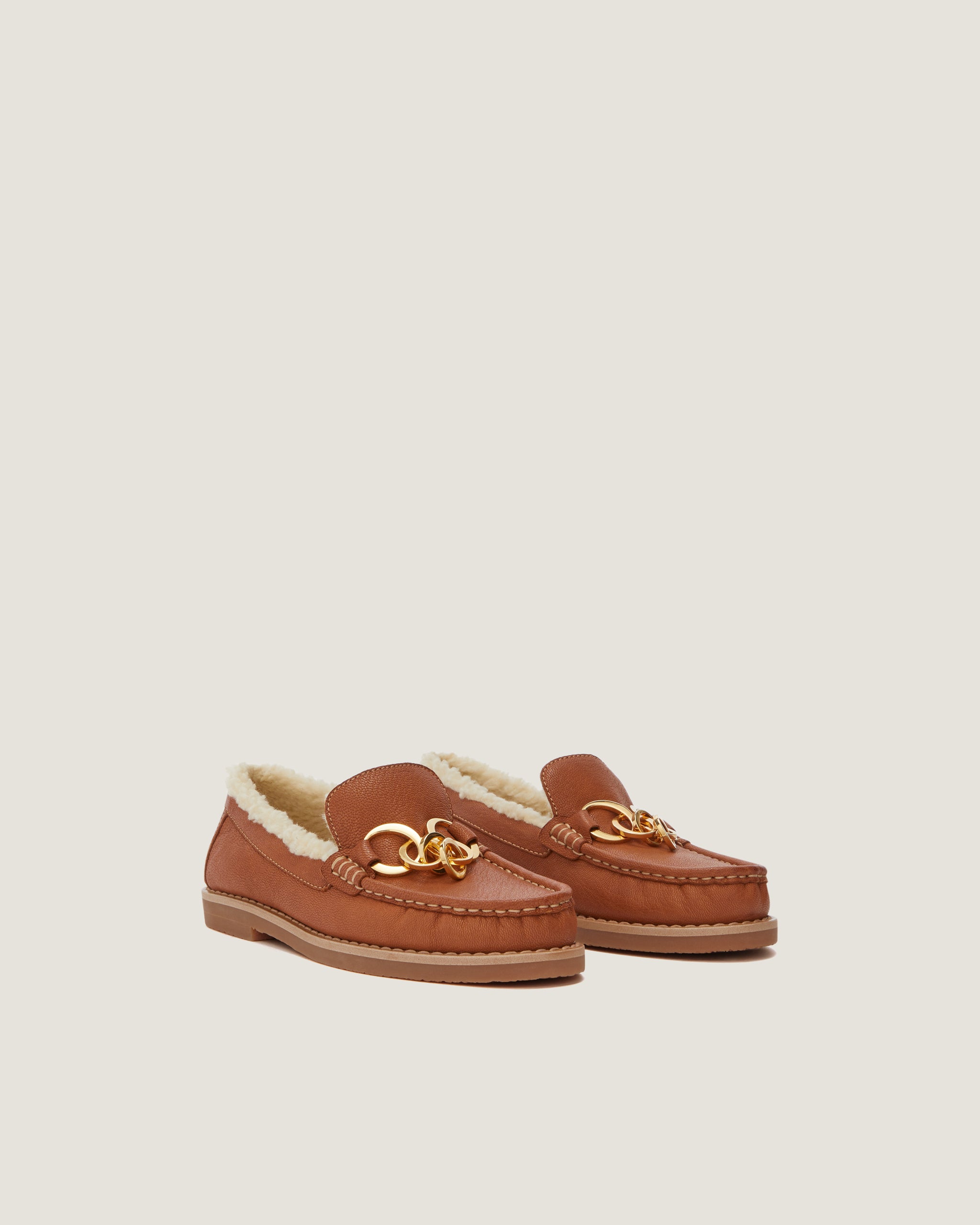 Lined in light faux shearling, the Jane loafer in tan goat leather is a winter-perfect version of a traditional penny loafer. It is adorned with a multi-O chain in gold-toned metal that adds a signature decorative touch. It features a tubular construction, padded insole, and hand-stitched details.